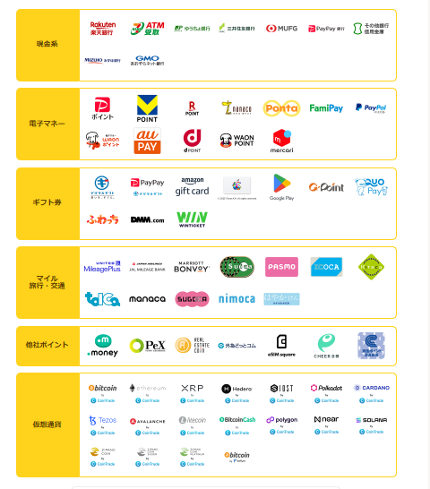 モッピーには60種類のポイント交換先があります。好きな交換先に交換してお買い物などで活用します。
